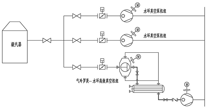 不改變原水環(huán)式抽真空系統(tǒng)的設(shè)備及功能,在抽真空主管道上并接一套羅茨—水環(huán)高效真空機組。