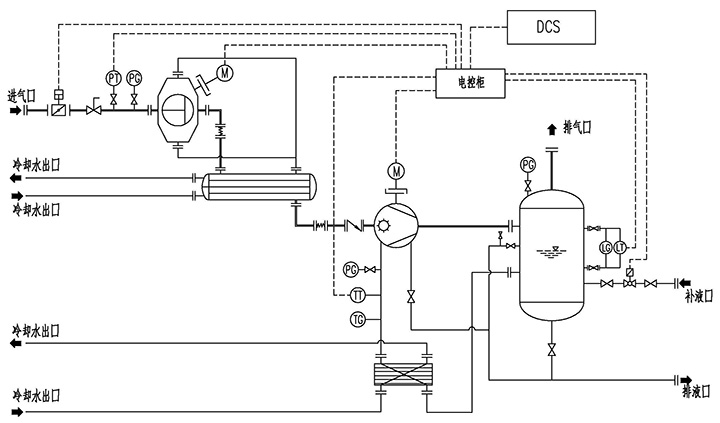 羅茨—水環(huán)真空機組主要配置為:羅茨真空泵、SKA(2BE1)水環(huán)真空泵、級間冷凝器、工作水換熱器、氣水分離器,以及必要的儀器儀表、管路、閥門、機架等。